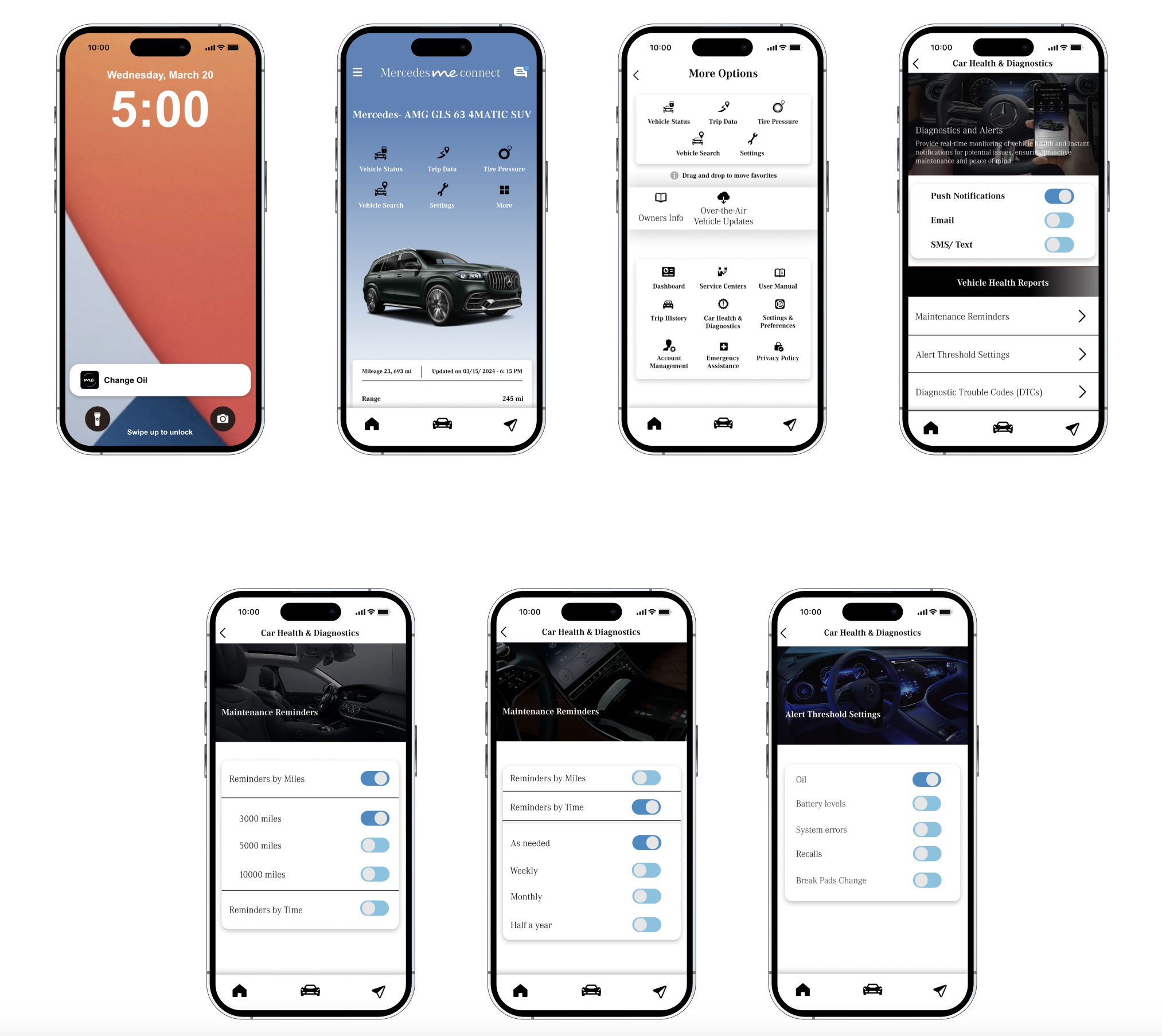 I created a UI design prototype for the MercedesMe app to provide an interactive preview of the interface. This approach allowed me to effectively showcase concepts and give stakeholders a tangible glimpse of the final aesthetics, functionality, and user experience. By doing so, I am able to gather valuable feedback early in the process, refine our designs, and ensure alignment with user expectations, ultimately enhancing the overall usability and appeal of the app.